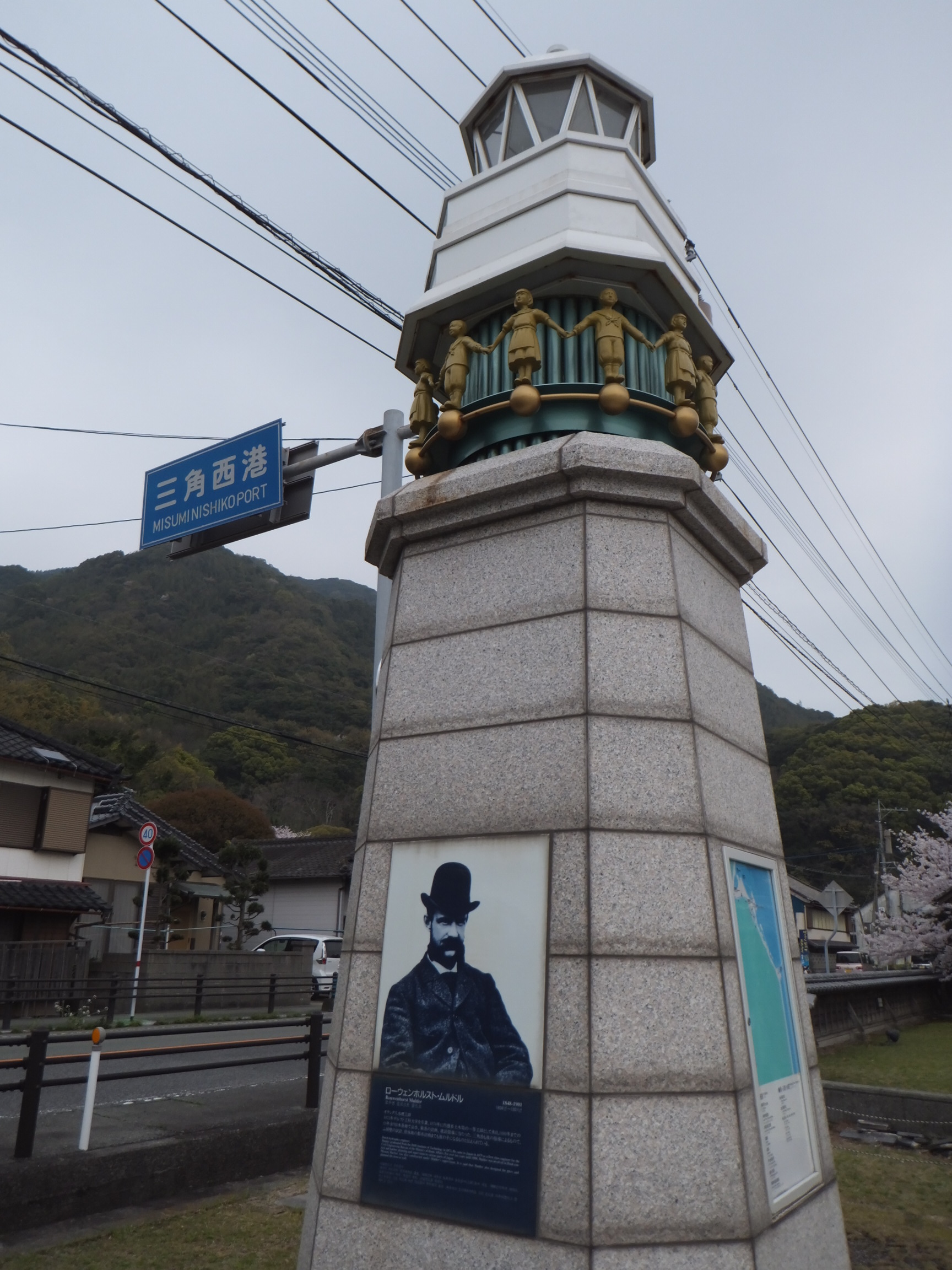 岸壁は当時のまま残っていて、「切石積」 という当時最新の工法が用いられているのだとか。 特に 頂部の石は、縦と横を交互に組み合わせた難易度の高い工法が用いられています(→ 右上写真・・・逆光で見難いですが)。 三角西港は、水理工師ムルドル氏(→ 左上写真の男性です) の功績が息づく 眺めの良い景色が広がっています。